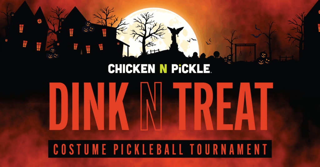 Join us for our Dink N Treat Pickleball Tournament, a Halloween event where you can play, party, and show off your spooky side. Come dressed in your best costume for a chance to win a $25 Chicken N Pickle gift card for the most creative look. Your tournament ticket includes a Monster Margarita to sip while you compete and enjoy a frightfully fun night on the courts.