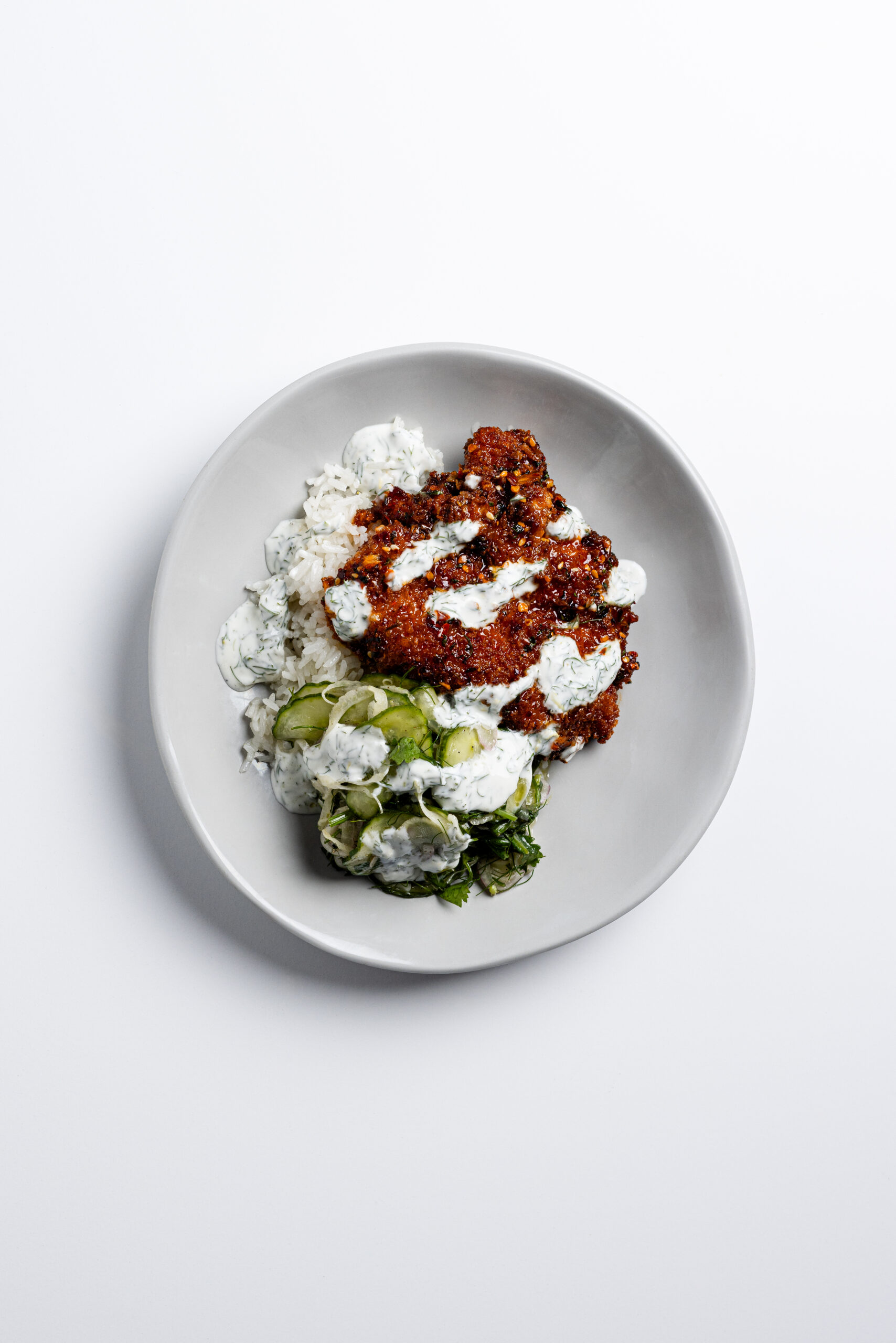 Panko Crusted Chicken Breast Coated in Honey Lime Crunch, Cilantro Lime Rice, topped with Pickled Veggies & Dill Lemon Yogurt