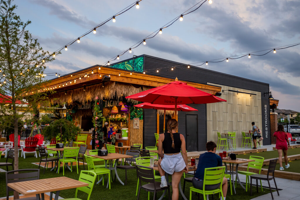 Features: 4 Picnic Tables in Centralized Outdoor Location, Direct Access to Shack Bar, Cornhole and Jenga Sets